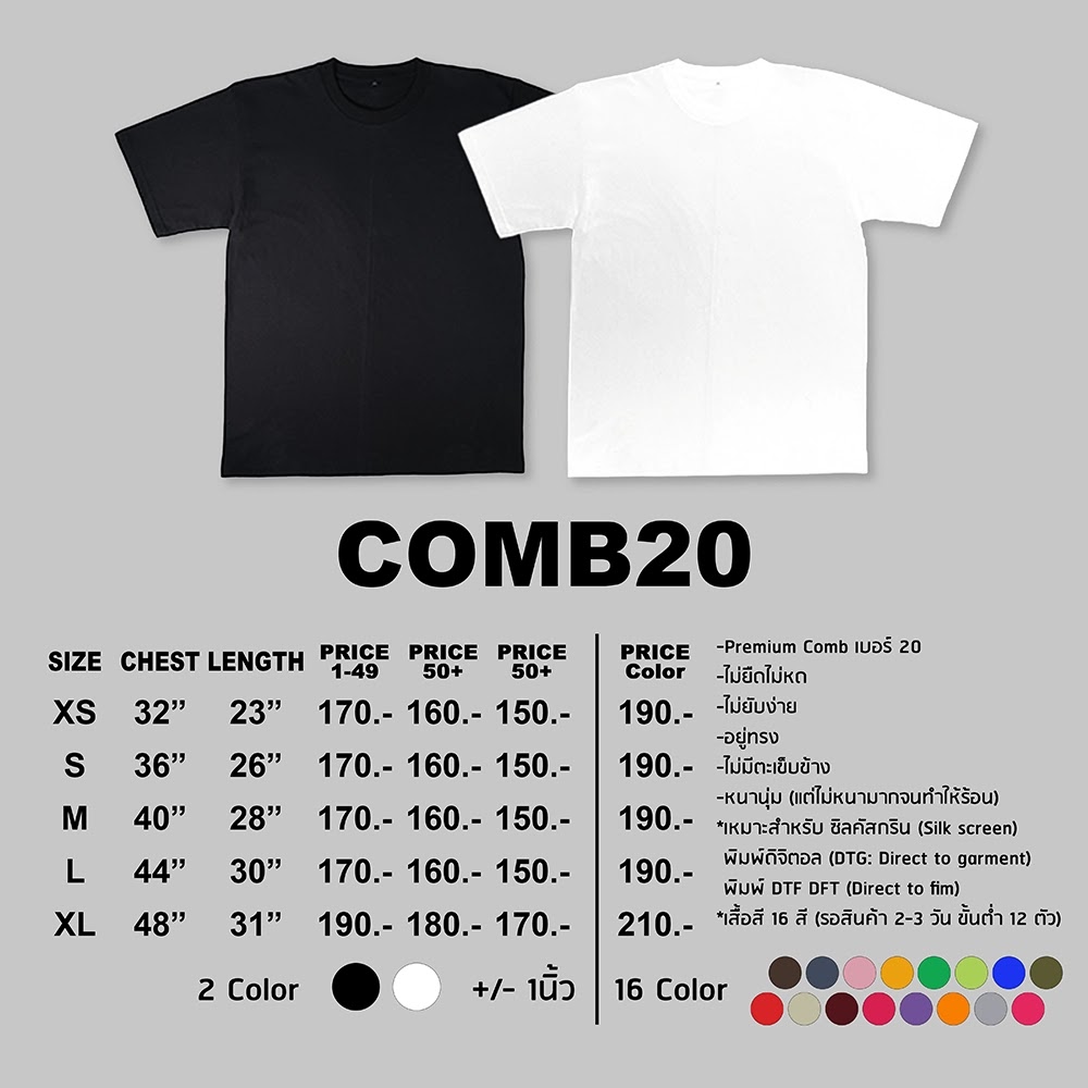 หากคุณกำลังมองหาเสื้อยืดเนื้อดี ที่เหมาะสำหรับต่อยอดทำแบรนด์ หรือใช้สกรีนลายคุณภาพสูง เสื้อ COMB20 คือคำตอบที่ลงตัวที่สุด ด้วยผ้า Cotton Combed 100% เบอร์ 20 ที่ทั้งเนียน นุ่ม ใส่สบาย และที่สำคัญคือ มีสีให้เลือกมากกว่า 16 เฉดสี ครอบคลุมทุกโทนที่คุณต้องการ